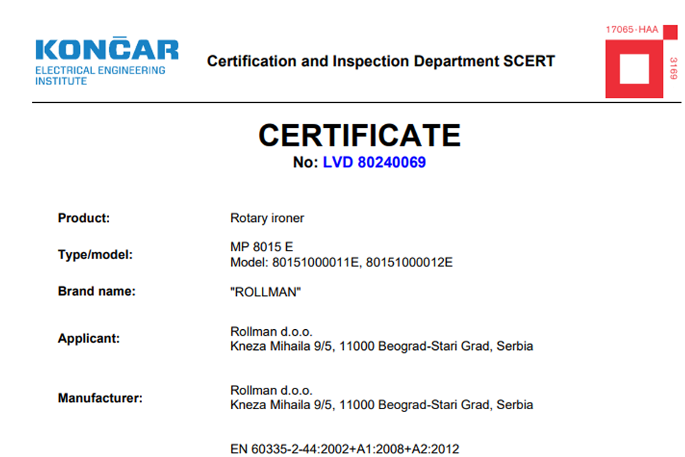Ο κύλινδρος Rollman συμμορφώνεται με τις απαιτήσεις των προτύπων και των οδηγιών της EMS 2014/30/ΕΕ. Το πιστοποιητικό επιτρέπει την τοποθέτηση της σήμανσης CE στο προϊόν.