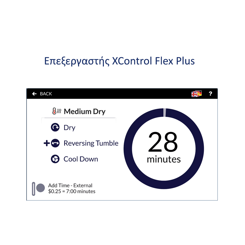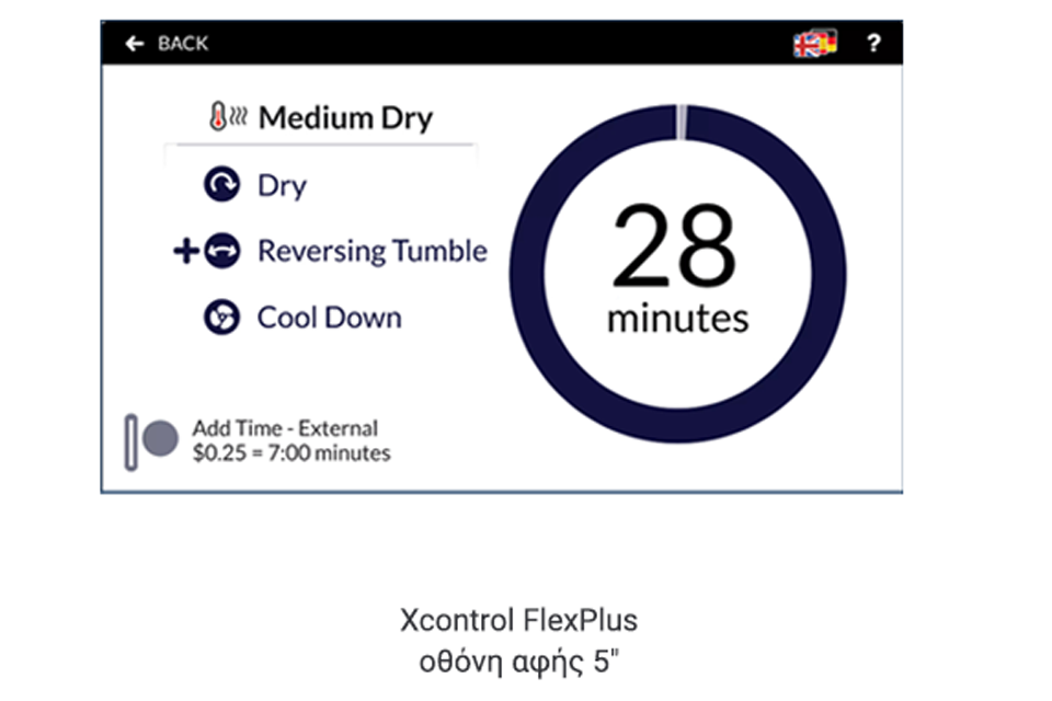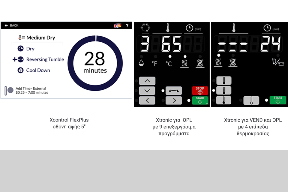 Xcontrol FlexPlus – οθόνη αφής 5″ πολύγλωσση, που προσφέρει εύκολο και διαισθητικό χειρισμό, με 11 κύκλους για VEND (στεγνωτήρια με κερματοδέκτη) και έως 99 κύκλους για OPL (στεγνωτήρια χωρίς κερματοδέκτη), Υποστήριξη 34 γλωσσών – ιδανική για διεθνή χρήση, Σύνδεση μέσω Cloud – δυνατότητα απομακρυσμένης παρακολούθησης και Ενσωμάτωση με i-Trace dashboard και εφαρμογή Primus App.