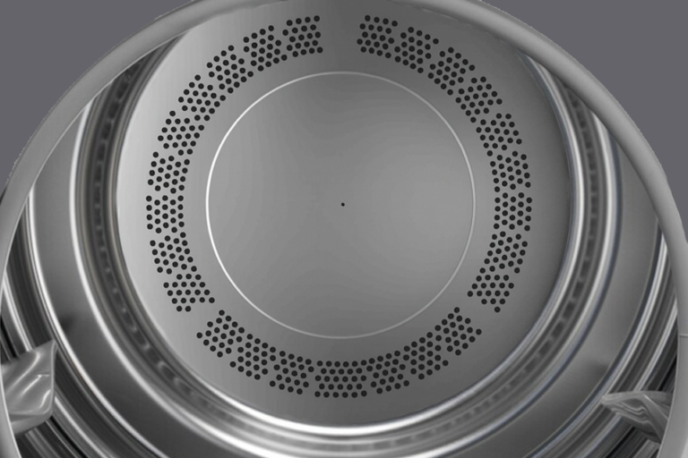 Ανοξείδωτος κάδος μεγάλης διαμέτρου με διάτρητες νευρώσεις που ενισχύουν τη ροή του αέρα. Εξασφαλίζει ομοιόμορφο στέγνωμα, μηδενική φθορά και κορυφαία αντοχή στη σκληρή καθημερινή χρήση.