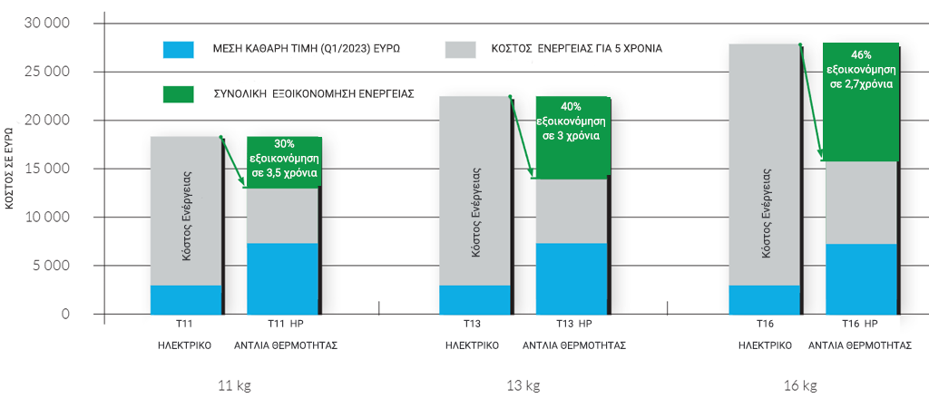 *Μέση καθαρή τιμή εξοπλισμού (Q1/2023), 8 κύκλοι/ημέρα, 250 εργάσιμες ημέρες/έτος, μέση τιμή ηλεκτρικής ενέργειας για μη οικιακή χρήση στην ΕΕ27 (Β’ εξάμηνο 2022)