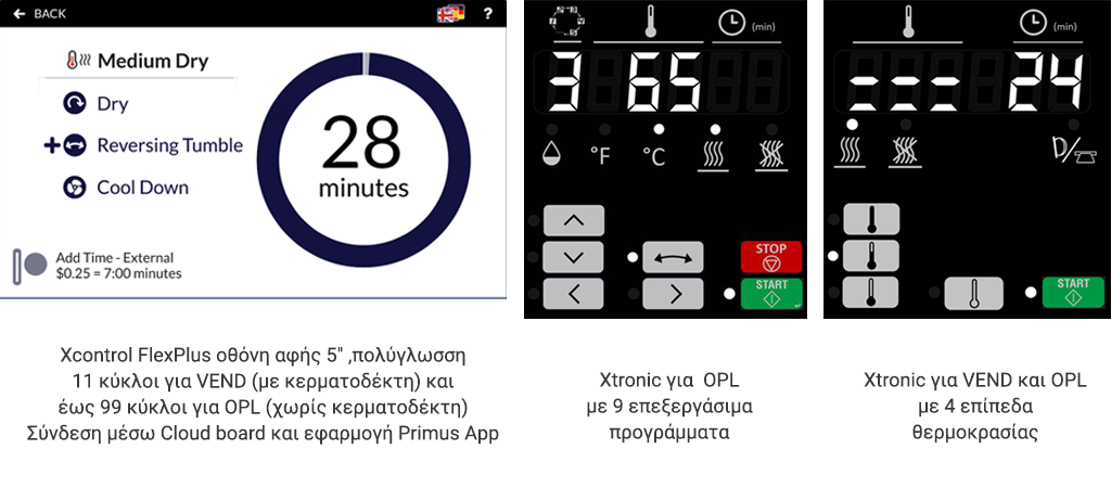 Xcontrol FlexPlus – οθόνη αφής 5″ πολύγλωσση, που προσφέρει εύκολο και διαισθητικό χειρισμό, με 11 κύκλους για VEND (στεγνωτήρια με κερματοδέκτη) και έως 99 κύκλους για OPL (στεγνωτήρια χωρίς κερματοδέκτη), Υποστήριξη 34 γλωσσών – ιδανική για διεθνή χρήση, Σύνδεση μέσω Cloud – δυνατότητα απομακρυσμένης παρακολούθησης και Ενσωμάτωση με i-Trace dashboard και εφαρμογή Primus App.